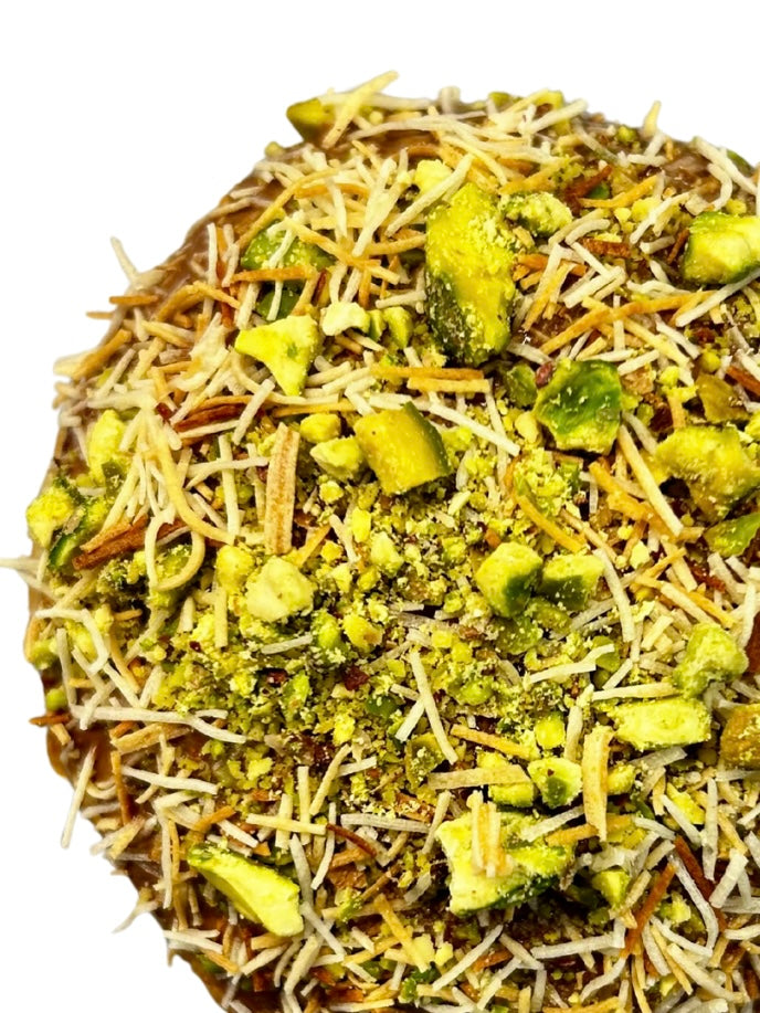 Ingredienser: Italiensk pistagekräm från Bronte (Sicilien, Italien), vit belgisk choklad, dadel sirap, tahini, kardemumma malen, belgisk mjölkchoklad, rostad kataifi, ljus muscovadosocker, strösocker, svensk utehönsägg, svensk vetemjöl special, bakpulver, vaniljextrakt, smör och salt.